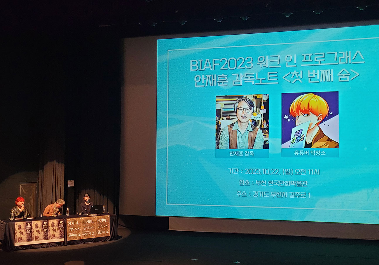 부천국제애니메이션페스티벌 (BIAF) 워크 인 프로그레스 (walk-in-progress) [아가미 감독노트 – 첫번째 숨] 안재훈 감독님의 애니메이션 <아가미>(원작 구병모)가 "소설이 애니메이션 영화로 만들어지는 과정"을 첫번째로 공개합니다. 이번 행사는 안재훈 감독님과 특별 진행자로 유튜버 덕양소님이 함께합니다. 10월...