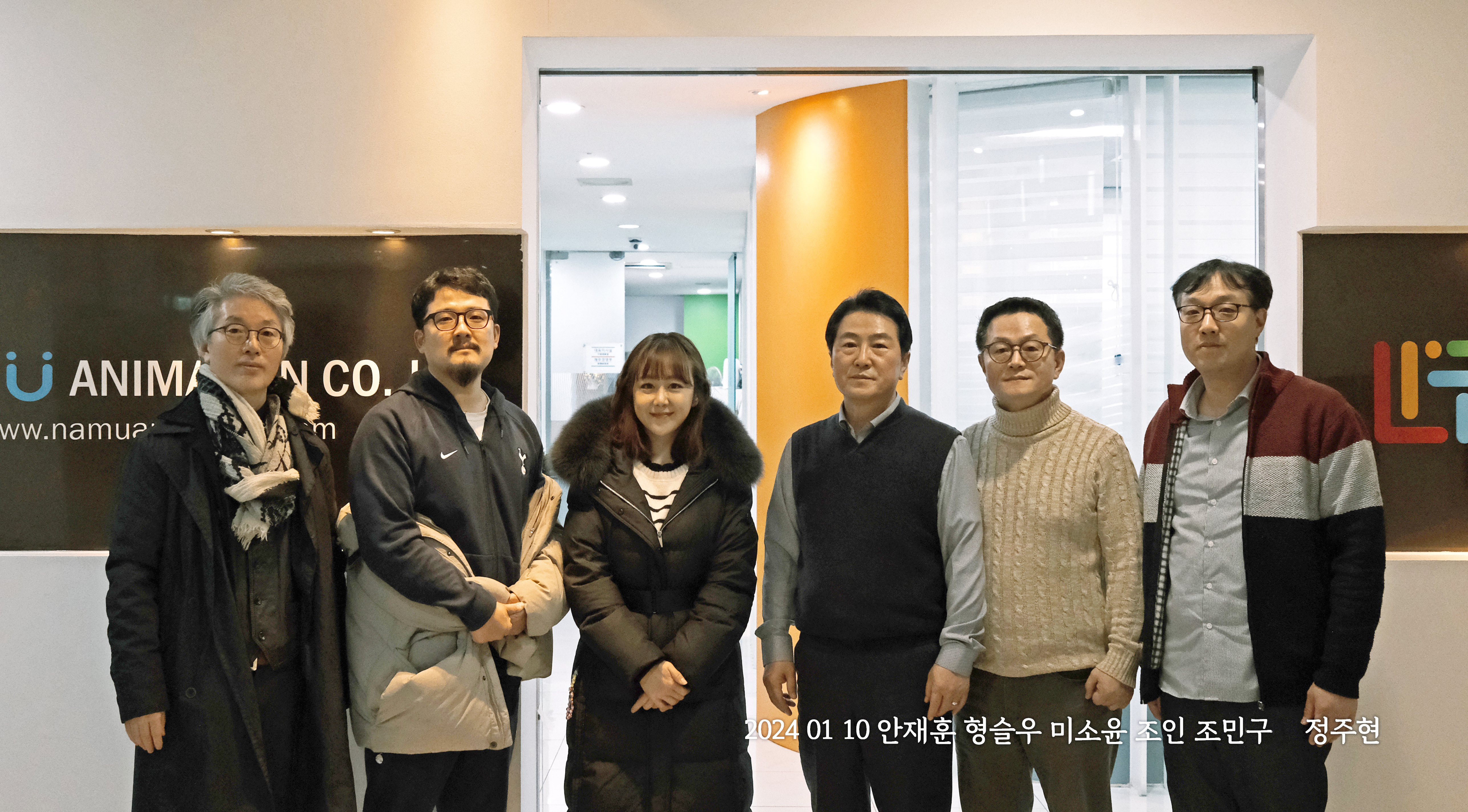 독립영화감독 겸 배우 형슬우 감독님과 미소윤 배우님이 2024년 1월 12일 (주)나무애니메이션에 방문하였다. 단편 독립영화를 다수 제작한 감독님과 함께 실사와 애니메이션 제작에 관련된 다양한 이야기와 의견들을 나누는 좋은 시간이 되었다. 형슬우 감독님의 시나리오를 애니메이션으로 제작하는 계획을 상담하였다. 애니...